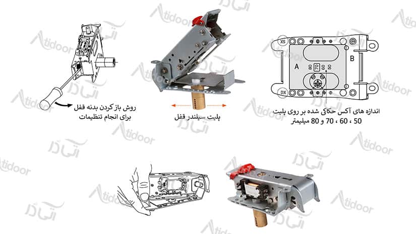 همچنین برای تنظیم اندازه آکس سیلندر قفل ، با توجه به اندازه های حک شده بر روی بدنه داخلی قفل ، اندازه آکس مورد نظر را تنظیم نمایید.