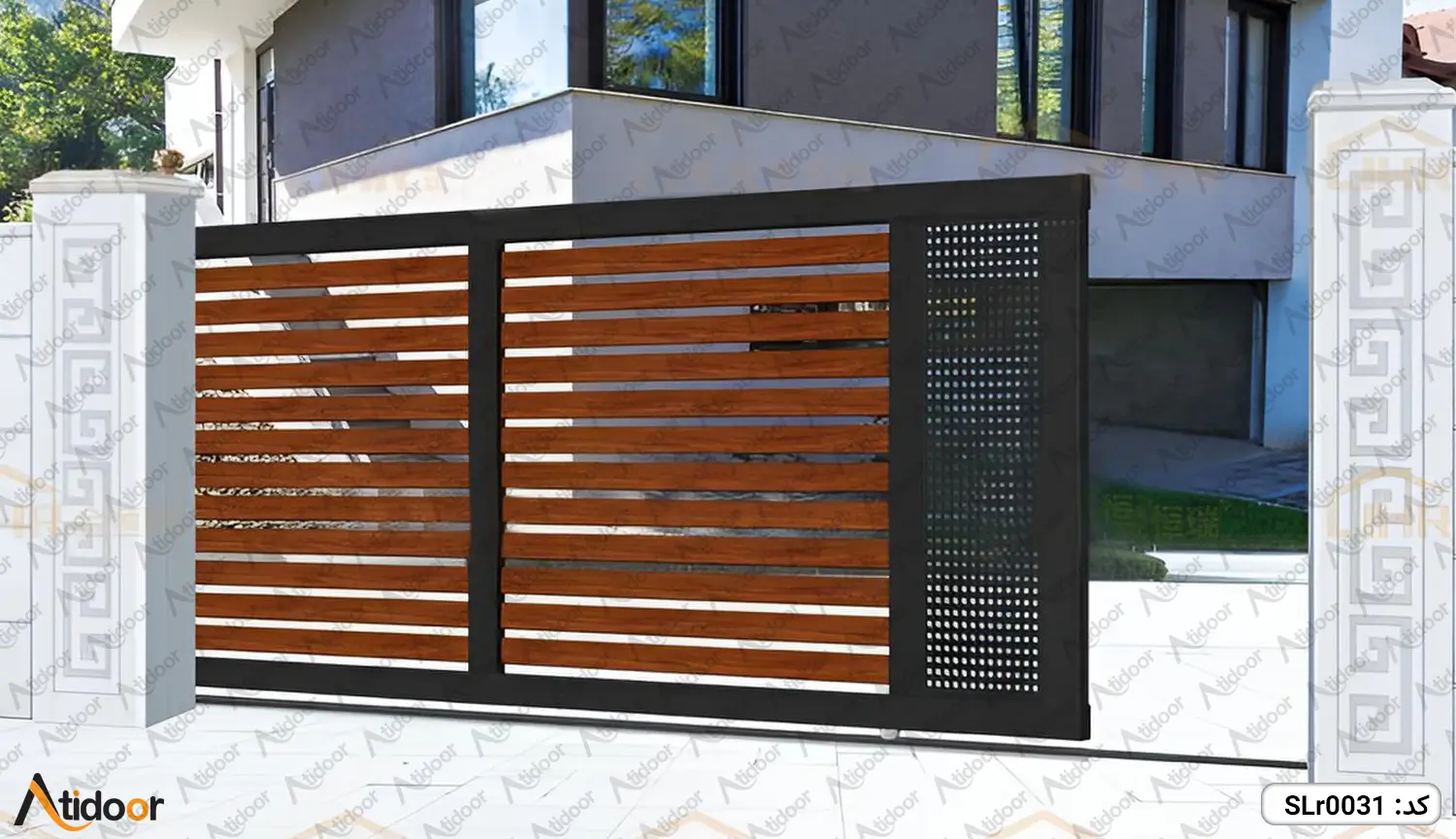 دسته: درب فلزی, درب ریلی, درب پارکینگ تلفیقی (چوب و فلز)